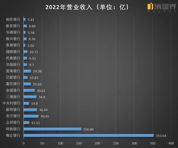 从2022年的营收看,微众银行和网商银行也是遥遥领先于其他民营银行。2022年,微众银行实现营收353.64亿元,在民营银行中一骑绝尘。根据消金界统计,2022年其他18家民营银行营收合计357.57亿元,与微众银行的353.64亿元基本持平。