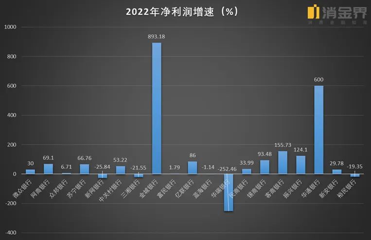 表现最亮眼的是天津金城银行,2022年,金城银行营收同比增长146.54%,净利润同比增长893.18%,营收增速和净利润增速都位居民营银行首位。