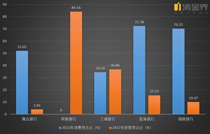 而网商银行,2022年个人消费贷占比清零,个人经营贷占所有贷款的84.16%。这应该与蚂蚁集团旗下的个人消费贷都逐步由蚂蚁消金承接有关。