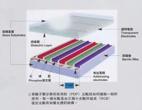 等离子电视的原理是,在两张超薄的玻璃板之间注入惰性等离子气体,再施加电压使R、G、B三原色荧光粉发光,每一个像素都是一个主动发光单元,在发光单元内部实现256级灰度后再进行混色,最终显示出正确的色彩。