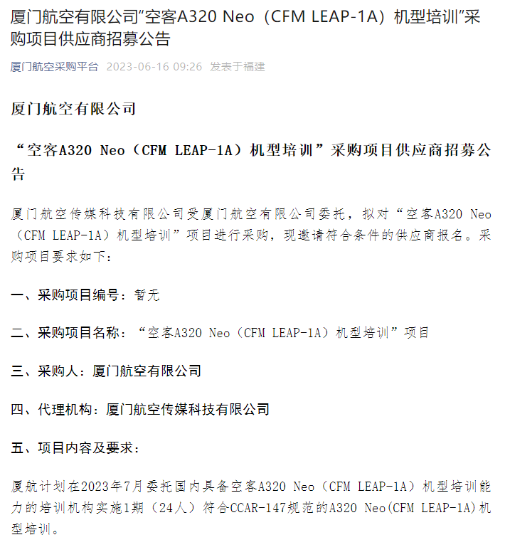 厦航计划在2023年7月委托国内具备空客A320 Neo(CFM LEAP-1A)机型培训能力的培训机构实施1期(24人)符合CCAR-147规范的A320 Neo(CFM LEAP-1A)机型培训。