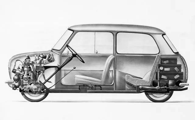 动力方面,由于受到成本制约,引擎必须采用现有型号。绞尽脑汁的Issigonis爵士最后大胆将引擎横置,变速箱塞进引擎底部与其共用润滑油,后来这种史无前例的前驱模式就被命名为“Issigonis Layout”。而Issigonis Layout在这台“小火柴盒”里压榨出占全车80%的客舱和行李空间,还为后世提供了一种全新的设计视野。