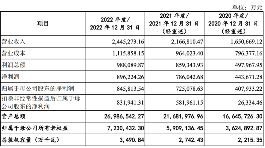 得益于此,华电新能的营收水平快速增长。招股书显示,2020年至2022年,公司营业收入分别为165.07亿元、216.68亿元、244.53亿元;同期净利润分别为40.79亿元、72.51亿元、84.58亿元。2023年前三个月,华电新能实现营业收入72.56亿元,较上年同期增长26.12%;实现净利润28.26亿元,较上年同期增长31.65%。