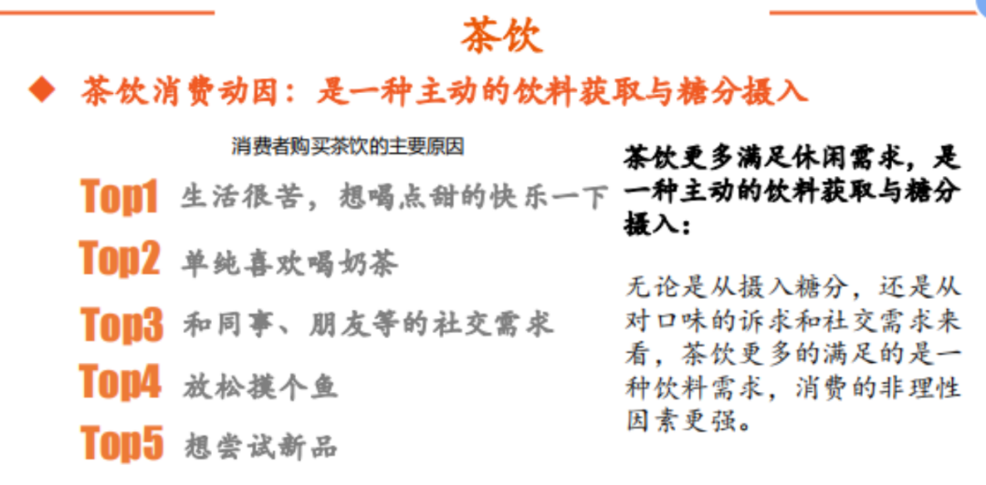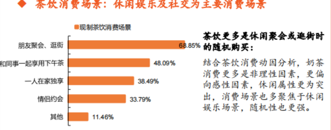 首先是消费场景,我们在上部分提到,茶饮属于休闲饮品,消费者经常是非理性消费,在商场逛街时随机购买。