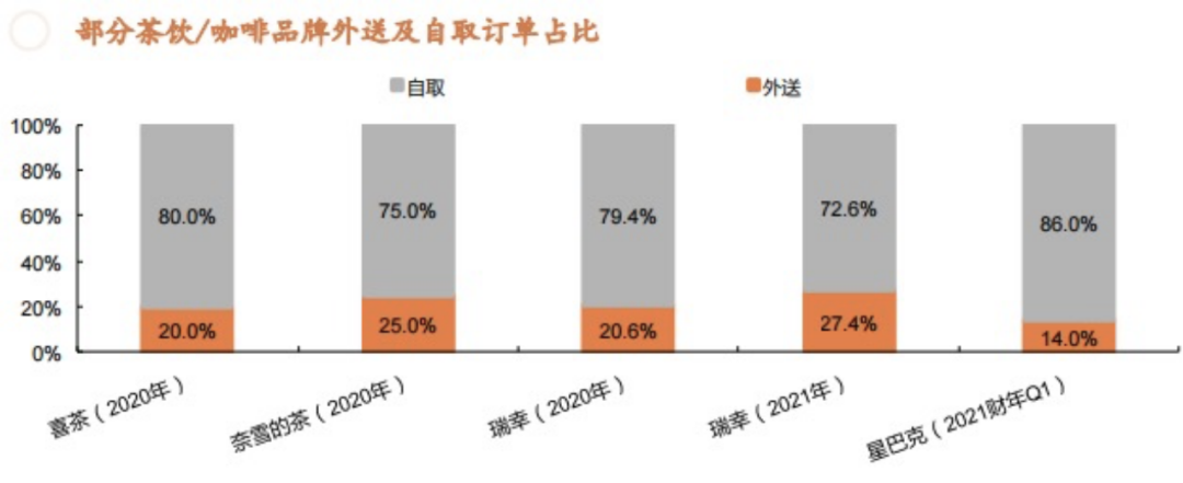 其实,头部品牌的咖啡店和茶饮店的外卖订单都不不高,例如瑞幸的外卖比例是20%-30%,星巴克的2021年Q1只有14%。