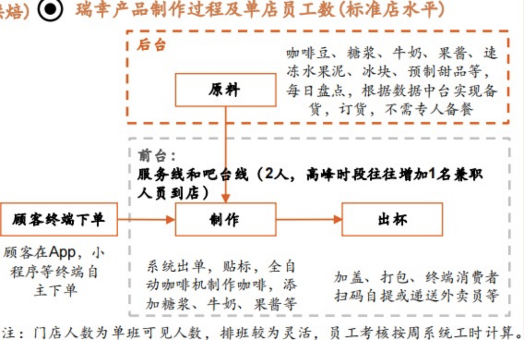 以快咖啡“瑞幸”举例,他们后台需要准备糖浆、牛奶、咖啡豆、果酱等,并不需要专门设置人员负责备餐。