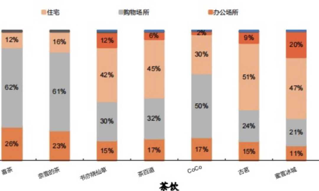 以奈雪为例,他们商场的门店占比就达到61%,其次是住宅区和办公区。