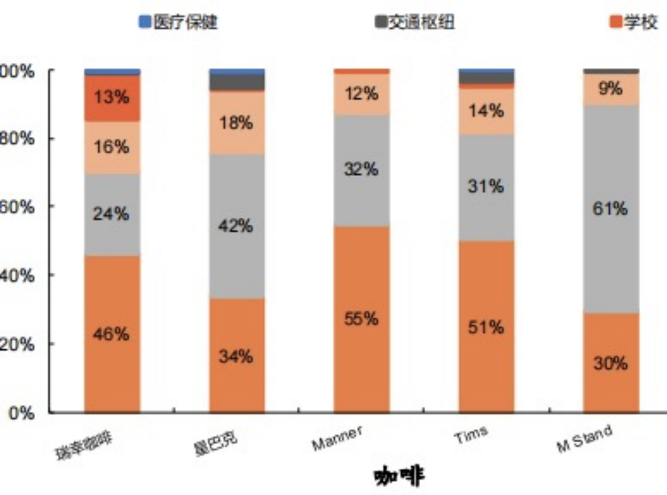 以星巴克为例,他们在交通枢纽附近的门店占比达到42%,办公场地附近的占比是34%。