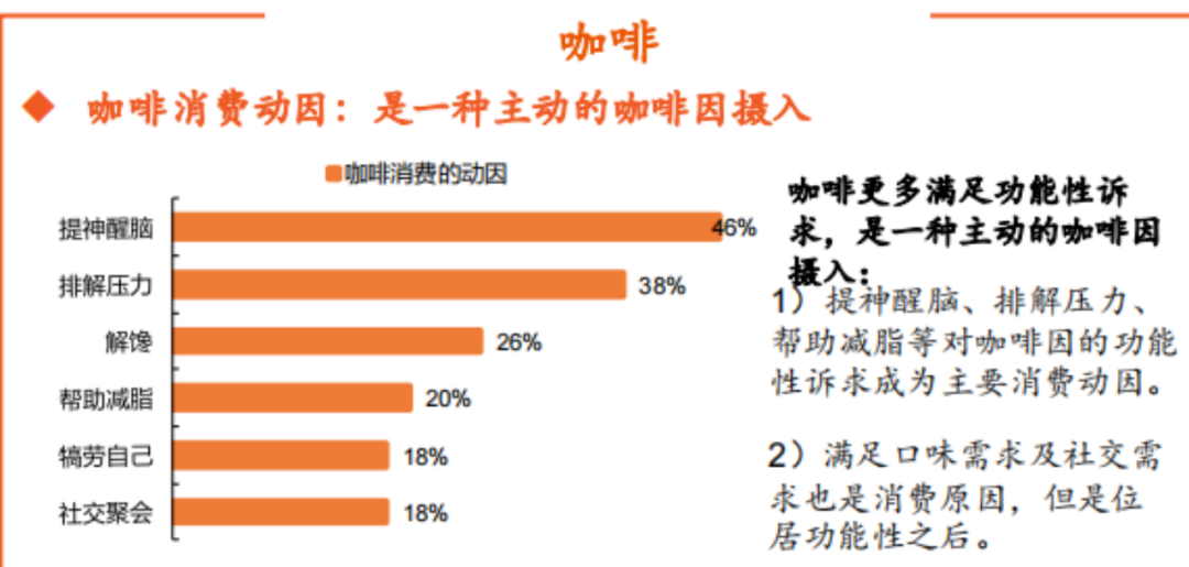 人们喝咖啡的动因侧重于提神醒脑,其次是排解压力,占比分别是46%和38%,但像是犒劳自己和社交聚会这样的消费目的,占比却只有18%。