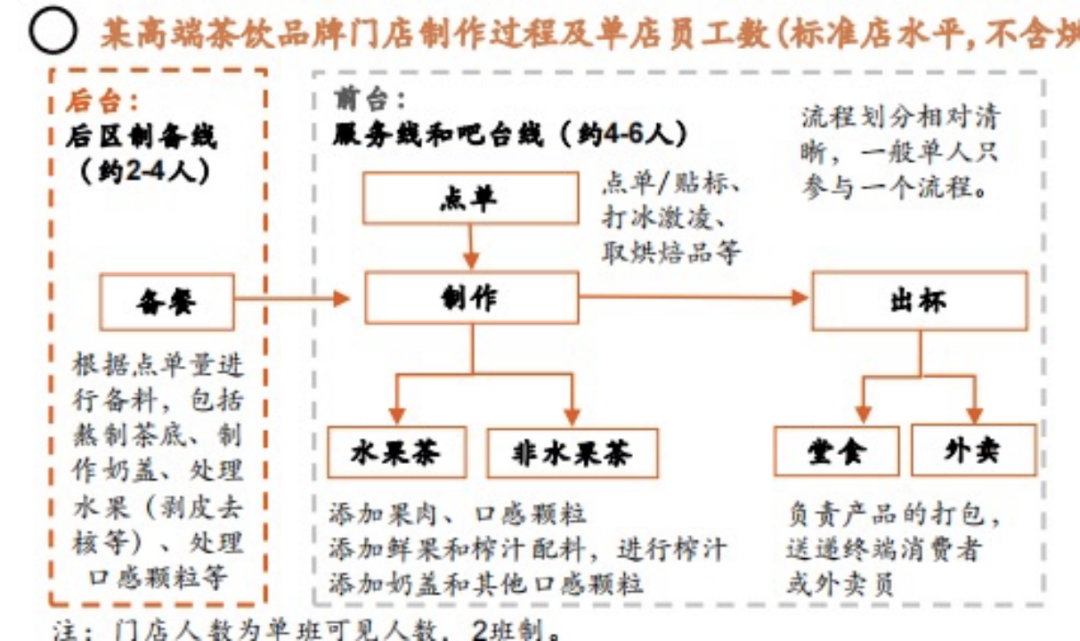 如果说高端茶饮制作流程更为复杂严谨,那么像是某中端茶饮品牌,也需要在后台置备至少1人,前台安排2人至3人。