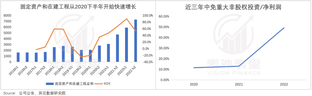 为了满足中产旺盛的购物需求,中免化身“基建狂魔”,大手笔建商场、开门店。尤其疫情期间,更是顶住压力逆势扩张,投资占利润比迅速抬升至50%左右。