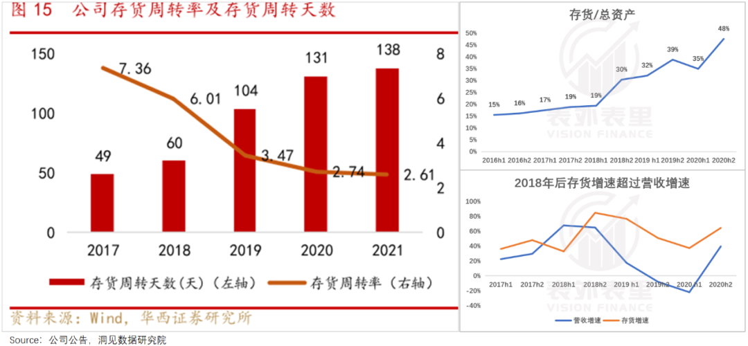 可以看到,2017-2020年,随着规模扩大,中免逐渐暴露出存货问题:总资产占比不断上涨的同时,存货周转率却在下滑;甚至从2018H2开始,其存货增长的速度持续超过营收增长的速度。