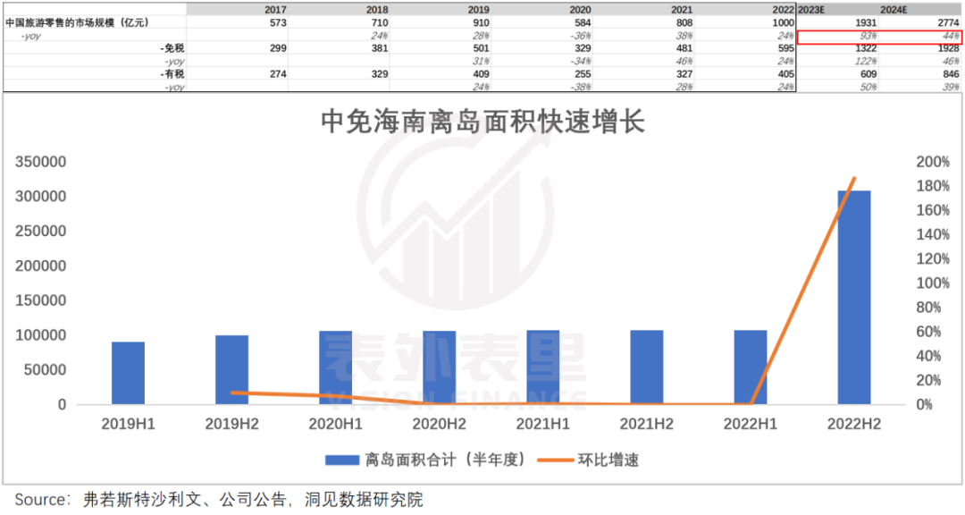 事实上,机构数据显示,2023年中国旅游零售市场预期增速高达93%,已经算乐观了,但对比中免的乐观——2022下半年离岛经营面积环比保持180%以上高增速,简直是小巫见大巫。