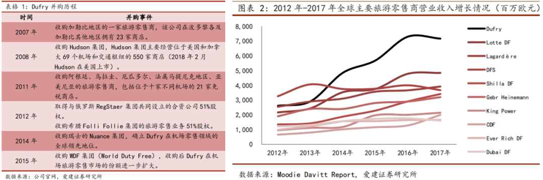 而在免税行当里,行业领头人Dufry验证过,扩张是抢占市场蛋糕的捷径,其中并购对业绩的贡献尤其明显。如2014年Dufry收购Nuance后,销售额同比增长17.5%,公司排名首次提升至旅游零售商排行榜第一名。