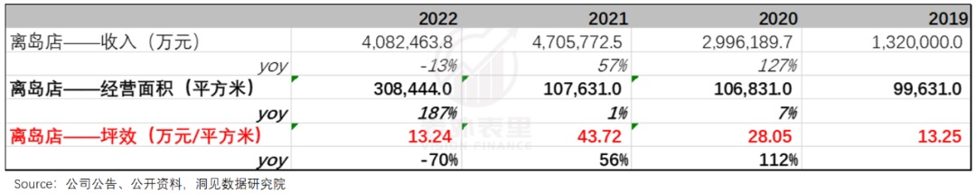 以收入大头离岛免税店为例,2019-2022年,离岛免税经营面积翻了三倍以上。但据测算,2022离岛店单位面积带来的收入增长为负值。