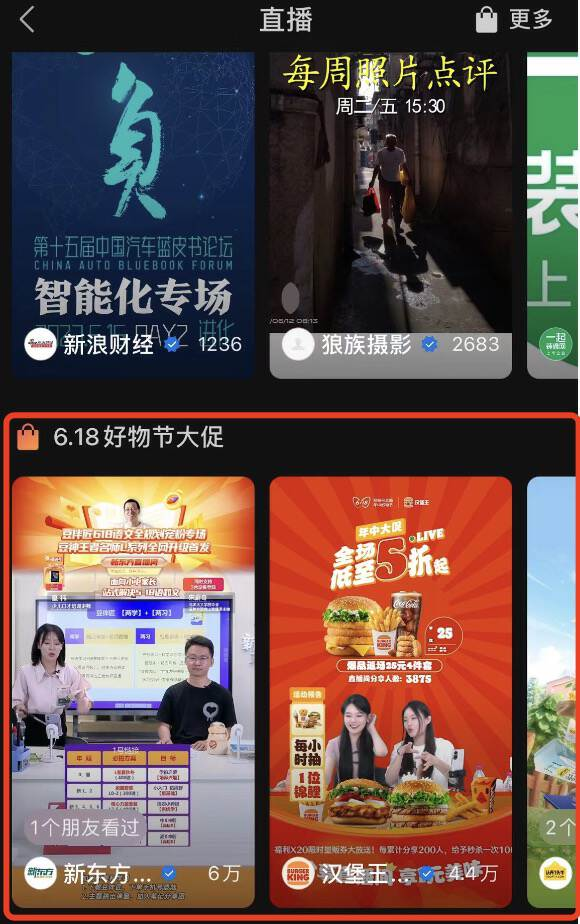 在视频号直播界面,关于618好物节大促的推荐页中,将店铺直播放置在了C位。这意味着视频号对于品牌商家的流量倾斜和曝光度相对较高。