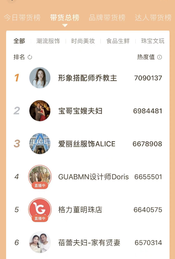 位于带货榜单首位的依旧以达人主播为主,以6月16日榜单为例,总榜排名前三的主播依次为,“形象搭配师乔教主”、“宝哥宝嫂夫妇”、“爱丽丝服饰ALICE"。