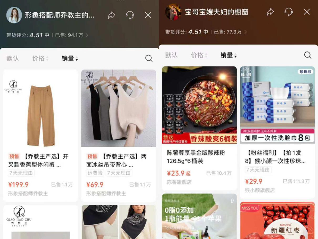 其中,根据主播的店铺橱窗销量显示,“形象搭配师乔教主”的直播品类是以客单价居中的服饰为主,销量最高的两款产品分别是售价199.9元的休闲裤以及售价69.9元的冰丝吊带背心;“宝哥宝嫂夫妇”则是以相对较低客单价的实物和生活用品为主,销量最高的两款是售价23.9元酸辣粉和售价29.9元的加厚洗脸巾。