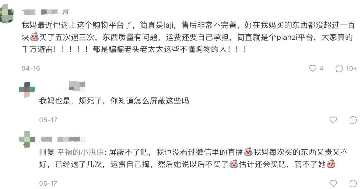 “视频号卖东西的离中老年人远一点!”,有小红书博主晒出了家里老人在视频号购物踩坑的经历,称从视频号里买了件打折衣服,但码数不合适,找客服退货一直不通过。