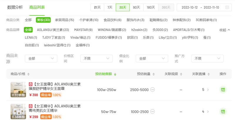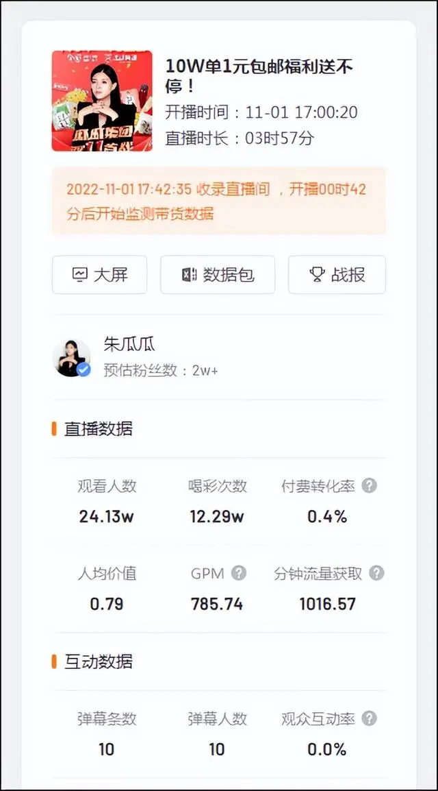 根据三方直播数据平台,据友望数据显示,朱瓜瓜在2022年11月1日这场直播的带货观看人数达24.13万人次,预估销售额为18.96万元。相较之下,其在抖音直播间的两款单品销售额已经达到了150万元-325万元。