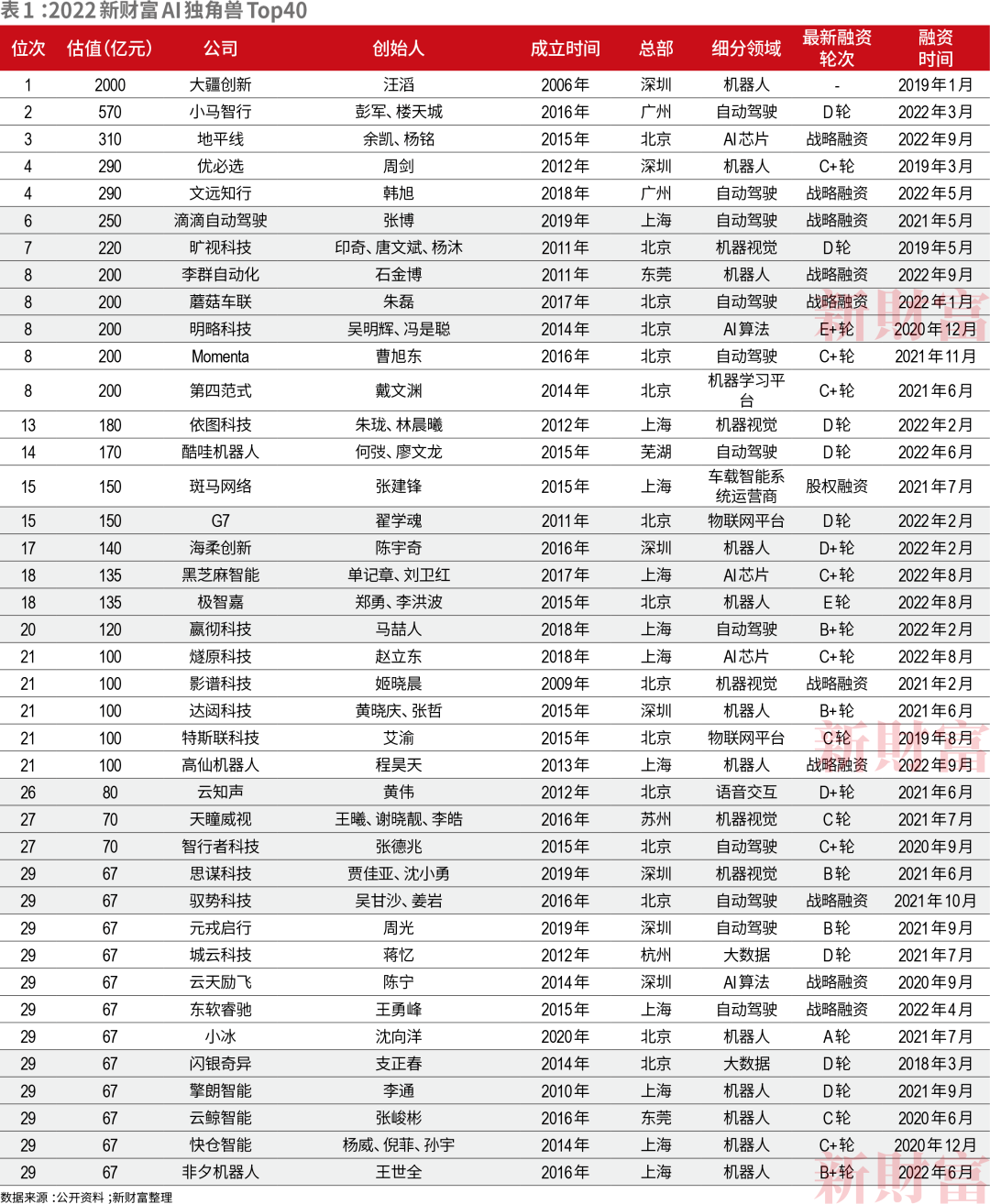 「探客出行」从《新财富杂志》获悉,在2022年底发布的“2022新财富AI独角兽TOP40”榜单中,蘑菇车联以200亿元(2022年1月)估值跻身榜单的并列第八位,距排名第六位的滴滴自动驾驶(250亿元估值)仅“一步之遥”。