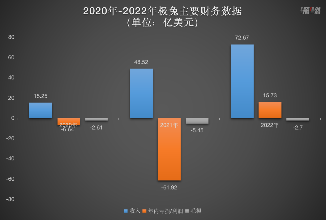 “激进”“疯狂”“迅猛”的极兔,财务数据也可以用恐怖来形容。2020年-2022年,极兔总收入分别为15.35亿美元、48.52亿美元和72.67亿美元,三年翻了近4倍。同期,极兔前两年是亏损状态,分别亏损6.64亿美元和61.92亿美元,2022年扭亏为盈实现15.73亿美元的年内利润。