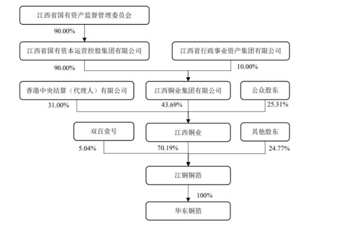 港股公司江西铜业(00358.HK)直接持有江铜铜箔70.19%股份,江西铜业集团直接持有江西铜业43.69%股份,为江铜铜箔的间接控股股东,江西省国资委则是实际控制人。