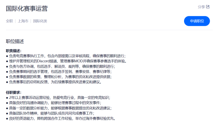 七圣召唤,是2022年12月左右才在游戏内实装的集换式卡牌游戏,玩家群体对该游戏褒贬不一,但这挡不住米哈游以七圣召唤为支点,切入电竞赛道的决心。除了奖金激励搞赛事,版本强推逼打牌以外,预言家游报发现,米哈游官网招聘栏放出《原神》赛事解说主持,以及赛事方向的市场商务人员等职位。其中,商务人员JD注明“负责七圣召唤赛事及衍生相关商务工作”。