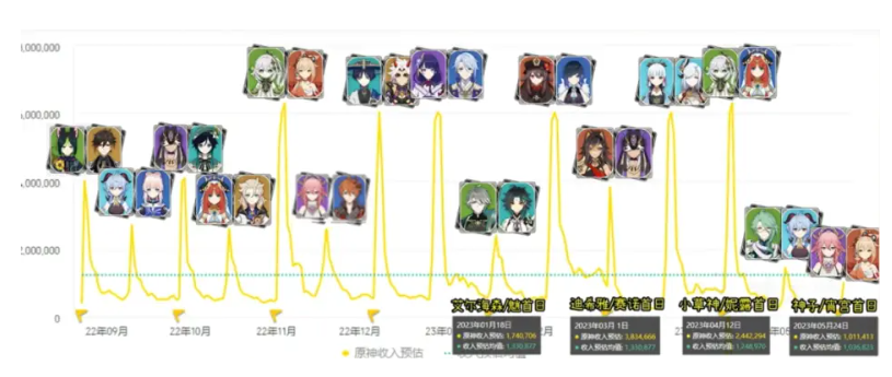 此外,表现强悍的《原神》在收入方面也露出颓势。一方面与《崩坏:星穹铁道》上线有关,4月26日《崩铁》上线后3天,5月17日“景元”up池上线后2天,《原神》总榜和游戏榜跌至第30和第18;另一方面,也与3.7版本强制打牌,长草期太长有关。