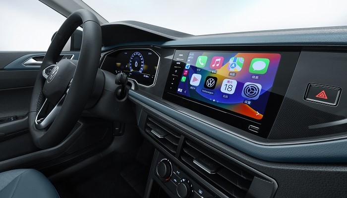 新车定位紧凑型轿车,但尺寸相较现款朗逸有所缩减。内饰方面也进一步精简,两块屏幕均采用内嵌式设计,而非大众品牌电动车的悬浮式布局。尺寸不大,但配置了无线CarPlay等手机映射功能。