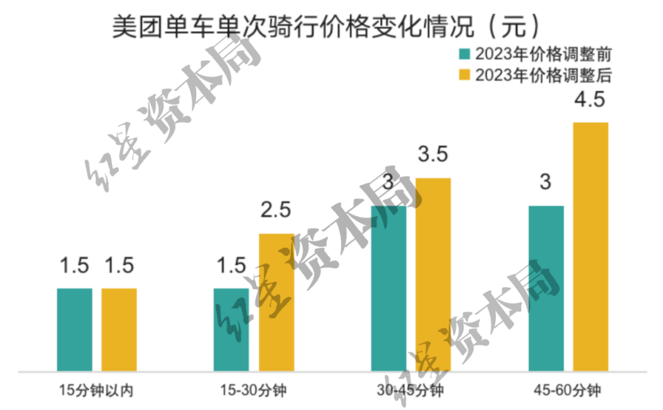 根据红星资本局整理的资料,今年1月23日起,美团在成都地区实行新的计价标准,之前起步价1.5元包含时长为30分钟,如今调整为15分钟;超时加价从1.5元/30分钟调整为1元/15分钟。这也是目前很多城市的收费标准:起步价1.5元含15分钟,超出15分钟后每15分钟加收1元。