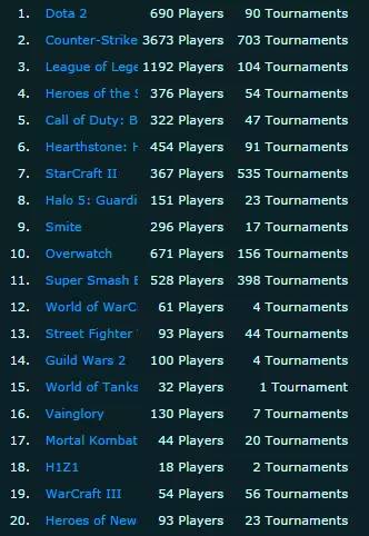 作为玩家基数最大的LOL,在职业选手人数上并没有太大的领先,虽然4283这个数字看起来十分美观,但是Valve在2012年推出的CS:GO反而后来者居上,以6034的职业玩家人数瑶瑶领先。作为经常与LOL相互比较的DOTA2,却只有寥寥1673名职业玩家。