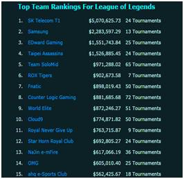 韩国在电竞方面一直走在许多国家前头,这一点在LOL上面体现的更加淋漓尽致。韩国在LOL奖金赢取方面已经拿下$13,497,889.93,相当于两个中国加一个美国的总奖金还有多。而韩国的俱乐部实力也是名列前茅,SKT自然是毋庸置疑的首位,紧随其后的仍是韩国的三星战队,而韩国新生的ROX战队在7场锦标赛中,用其强悍的战力迅速攀升至世界第6。