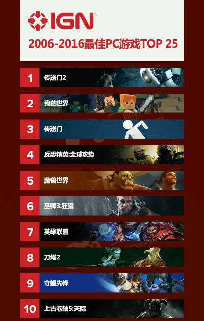 全球规模最大的游戏娱乐媒体IGN,在2006年度至2016年度最佳PC游戏排行评比中,让LOL以第七名的优秀成绩名列前茅。而在这份前十的排行当中,电子竞技游戏就入选了四位,由此可见电子竞技的魅力。