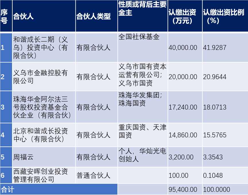 义乌奇光共有5个LP(有限合伙人),且个个不简单。LP中除了全国社保基金、自然人周福云(IDG之前投资过的自然人、上市公司华灿光电创始人)以外,其他均为地方国资,包括义乌、珠海、天津、重庆等地。