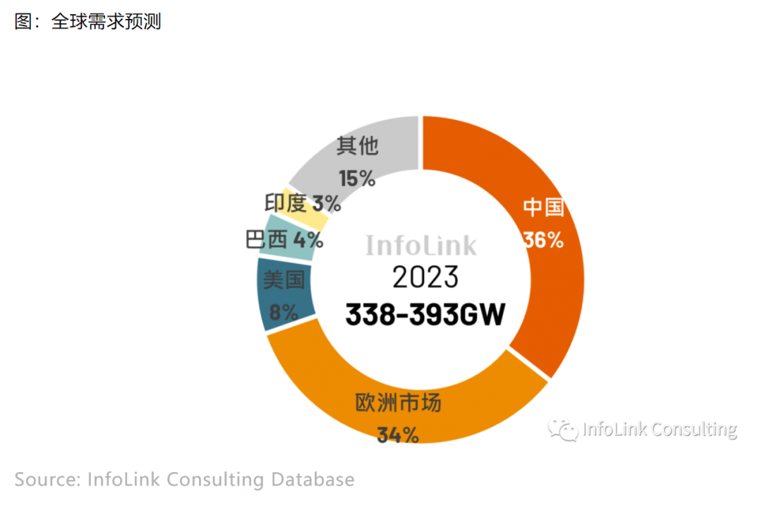 Infolink Consulting预测,2023年全年光伏需求约在338-398GW,中国、欧洲的需求量继续位列前二。