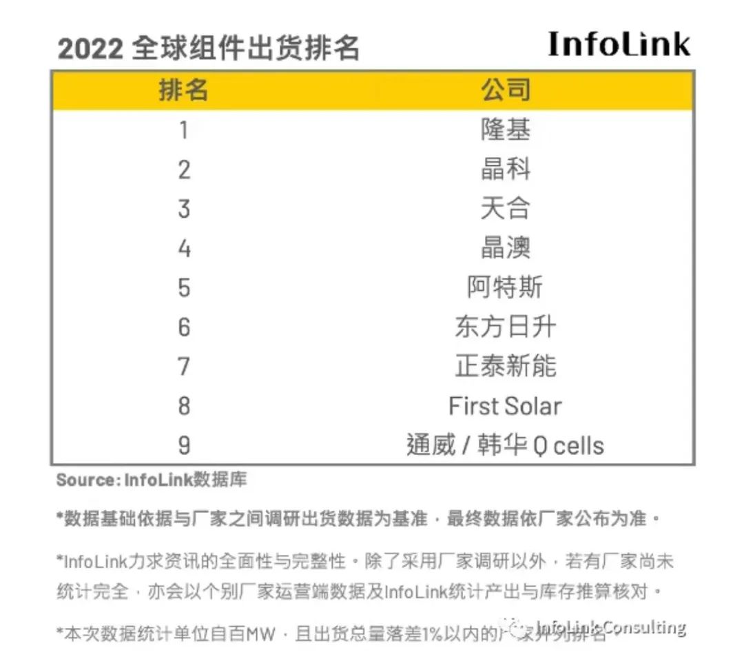 此外,4月17日,在 InfoLink Consulting发布的2022年全球组件出货排名Top10中,通威股份也成功上榜,与韩国厂商韩华Q cells并列第九。