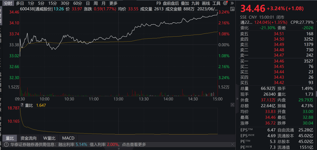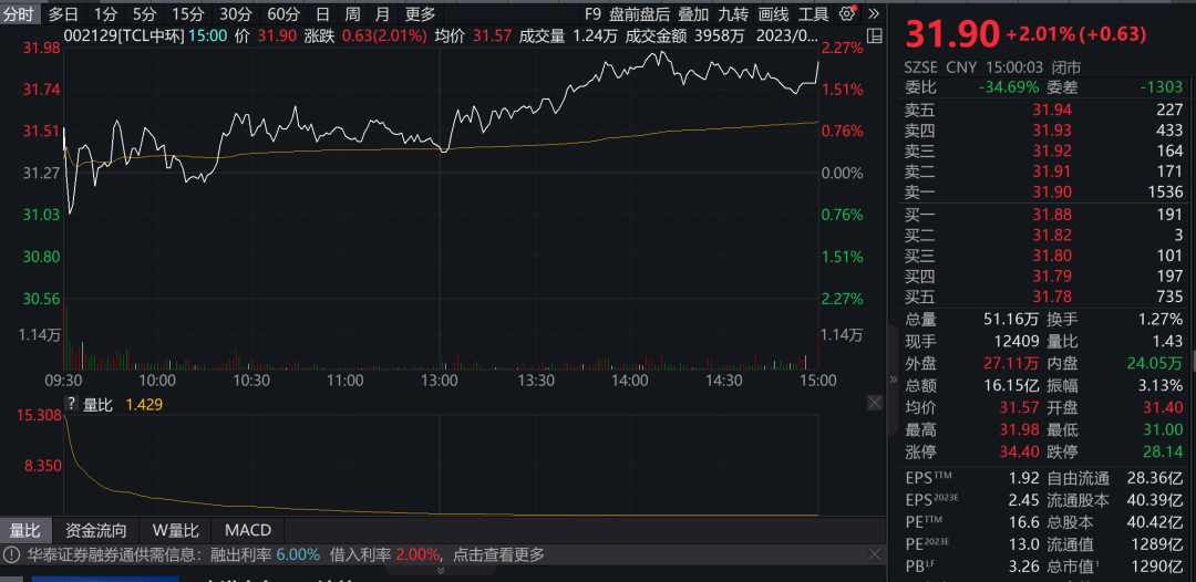 参股公司“短兵相接“,但从二级市场来看,两家公司股价均不降反增,6月16日,TCL中环报收31.9元/股,涨幅2.01%,总市值1290亿元;同期通威股份则报收34.46元/股,涨幅3.24%,总市值1551亿元。