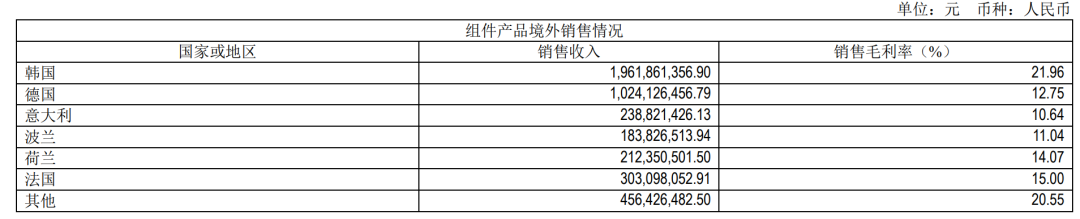 年报显示,2022年,通威股份境外组件产品销售数据中,排在前6位的分别为韩国、德国、法国、意大利、荷兰、波兰,其中2-5名均为欧盟国家,合计贡献19.62亿元的收入,同比增长131.91%。