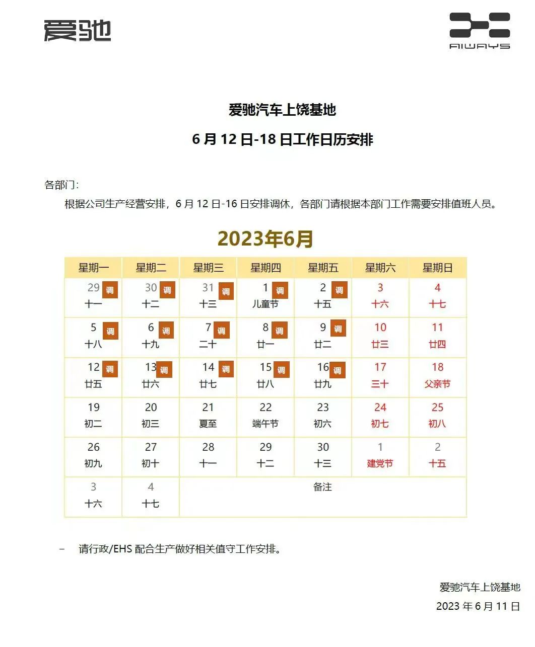 爱驰引以为傲的江西上饶工厂,目前也已处于停摆状态。一位当地的爱驰员工告诉雪豹财经社,从今年2月起,上饶工厂就开始上3休4;从5月起,工厂开始全员“调休”,只留少数员工值班。