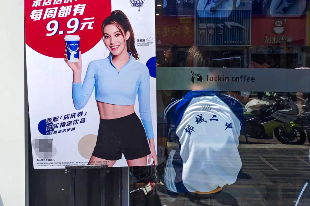 在临沂市郯城县,一位中学生在瑞幸咖啡门店内等咖啡