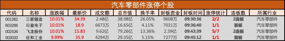6月19日,汽车零部件板块集体拉升,截止发稿,三联锻造(001282)2连板,日盈电子(603286)、飞龙股份(002536)涨停,华依科技涨、金杯汽车、明新旭腾、经纬恒润、西菱动力等多股大涨。