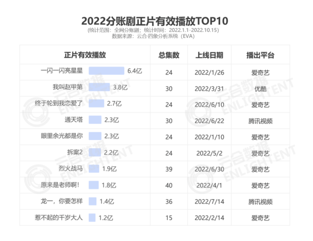 一种解释是市场体量提升拉高了头部数据,《分账剧发展与市场分析报告》显示,虽然2022年连续剧市场体量下滑4%,但分账剧流量却出现了逆市上扬,在2022年播放量高达87亿,同比上升10%;而取得这个成绩的同时,分账剧上新53部,较2021年同期还减少了6部。
