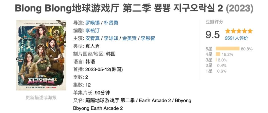 “韩国第一综艺PD”罗英锡也偏爱全女综,去年由他执掌的《Biong Biong地球游戏厅》打出“4名女勇士穿越时空”的元宇宙动作冒险综艺概念,在全韩拿下3.5%超高收视率。在国内,该节目也在豆瓣揽下9.2高分,而刚巧在上个月推出的第二季更涨分到9.5。