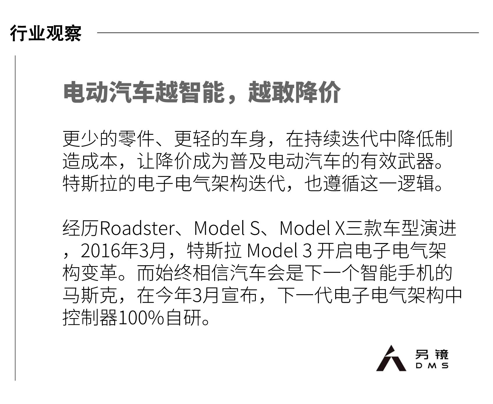 更少的零件、更轻的车身,在持续迭代中降低制造成本,让降价成为普及电动汽车的有效武器。特斯拉的电子电气架构迭代,也遵循这一逻辑。