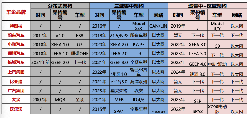 蔚来、小鹏、理想正在以每1-2年更新一次架构的速度在追赶特斯拉。中国传统车企上汽、广汽、比亚迪在追赶电动汽车创业公司“蔚小理”。豪华车品牌沃尔沃和经济型品牌大众,其架构进化则一快一慢,同时侧面反映两类公司的转型难度。