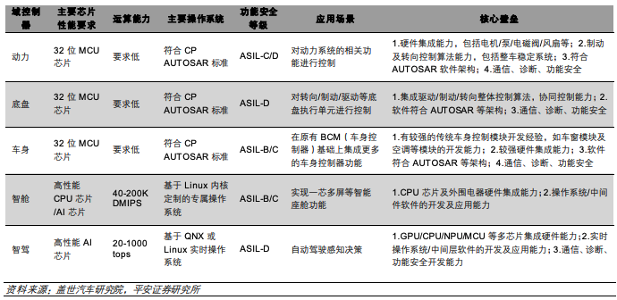 汽车产业链一级供应商(Tier1)博世把汽车分为五个功能域,包括动力域、底盘域、车身域、 座舱域和自动驾驶域。随着电子电气架构升级,硬件架构会进一步将动力域、底盘域、车身域合并为整车控制域,功能域从五个过渡到三个(自动驾驶域、智能座舱域、车控域)。