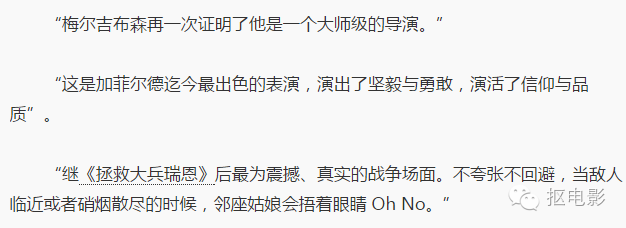 从被蔑视为“猪一样的队友”,到成为真正的英雄,如何将这种前后反差融化在电影中,并让观众信服,这很难 如何将这种“傻白甜”人设发挥到极致,把心灵鸡汤似的“信仰”放在杀伐决断的战场上来说,却不让观众觉得“这货就是个傻阿(er)甘(bi)呀,谁不会呀”,这点更难 但是从观众反馈的口碑中,无疑,梅尔·吉布森完成的很好