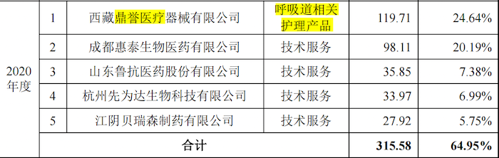 界面新闻记者注意到,2020年长风药业前五大客户中四家客户的销售内容均为技术服务,仅第一大客户西藏鼎誉医疗器械有限公司系销售呼吸道相关护理产品,金额为119.71万元,占主营业务收入的比例为24.64%。
