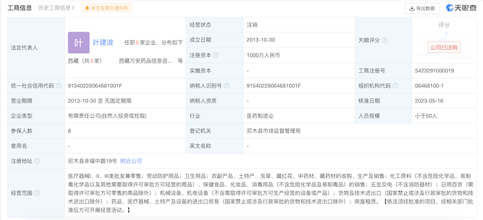 据悉,西藏鼎誉医疗器械有限公司成立于2013年,公司参保人数为8人,叶建波为该公司法人、执行董事兼总经理。